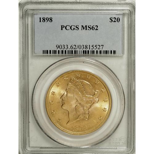 <B>1898 $20 MS62 PCGS.</B></I> This low-availability date has plentiful mint luster and a strong strike on each side.<BR><BR><b>Shipping:</b> Coins & Currency (<a target="_blank" href="http://www.heritageauctions.com/common/shipping.php">view shipping information</a>)