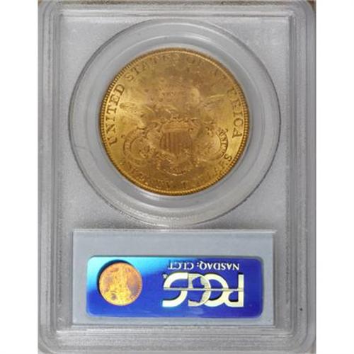 <B>1898 $20 MS62 PCGS.</B></I> A satiny and sharply struck example, predominantly peach-colored with soft orange overtones. Small to moderate abrasions on each side restrict the grade of this still-pleasing P-mint piece.<BR><BR><B>Coin Engraver:</B> James B. Longacre<BR><BR><b>Shipping:</b> Coins & Currency (<a target="_blank" href="http://www.heritageauctions.com/common/shipping.php">view shipping information</a>\)