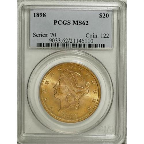<B>1898 $20 MS62 PCGS.</B></I> Decisively struck with vibrantly lustrous yellow-orange surfaces that lighten slightly near the centers. Few marks appear in the fields, and if not for an abrasion on Liberty's neck, this piece could have achieved a finer grade.<BR><BR><B>Coin Engraver:</B> James B. Longacre<BR><BR><b>Shipping:</b> Coins & Currency (<a target="_blank" href="http://www.heritageauctions.com/common/shipping.php">view shipping information</a>)