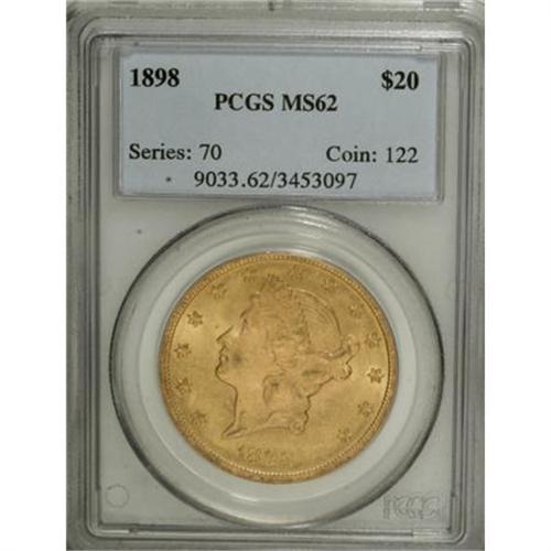<B>1898 $20 MS62 PCGS.</B></I> Sharply struck with slightly satiny butter-yellow and sun-orange surfaces that shimmer softly beneath the light. Minor, scattered abrasions on and around the devices account for the grade.<BR><BR><B>Coin Engraver:</B> James B. Longacre<BR><BR><b>Shipping:</b> Coins & Currency (<a target="_blank" href="http://www.heritageauctions.com/common/shipping.php">view shipping information</a>)
