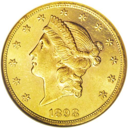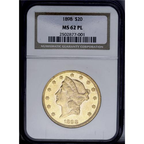 <B>1898<$20> MS62 Prooflike NGC.</B></I> A stunning yellow-gold example with hints of cantaloupe and honeydew. The sharply detailed devices are slightly satiny, and the obverse's eye appeal is suggestive of a higher grade. NGC has certified only three examples of this issue as prooflike, and this piece is tied with one other at the top (7/06).<BR><I>From The New York Eye Appeal Collection.</B></I>