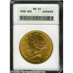 <B>1898 $20 MS63 ANACS.</B></I> Frosty and lustrous with light abrasions on both sides. This is a pleasing example and elusive in higher Mint State grades. Only a couple dozen finer examples of this date are known.<BR><I>From The Richard J. Chouinard Collection of United States Coins, Part Three. Ex: Stack's (10/01), lot 1025.</B></I>