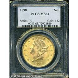 <B>1898 $20 MS63 PCGS.</B></I> Medium yellow-gold in color with a slight blush over Liberty's cheek. The surfaces are attractive for the grade and show minimal signs of handling. As with most double eagles, finding a coin in this grade is quite a challenge, and obtaining a finer example is very, very difficult indeed. Population: 67 in 63, 7 finer (1/05). Lot:9271