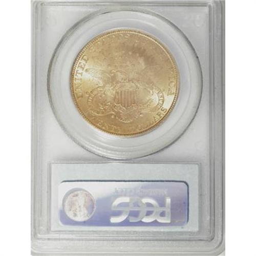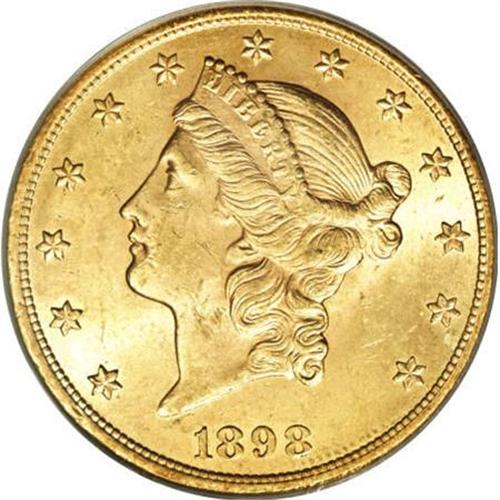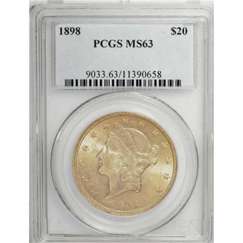 <B>1898 $20 MS63 PCGS.</B></I> Garrett and Guth (2006) describe this as a challenging lower-mintage Philadelphia issue, noting that it is "seldom seen above MS62." This Select piece is an attractive exception. The strike is solid, and subtle rose-peach accents grace the lustrous, slightly satiny surfaces. Though a few fine abrasions appear on the portrait, a more appealing example would be hard to come by; PCGS has graded only seven finer representatives (1/08).<BR><BR><B>Coin Engraver:</B> James B. Longacre<BR><BR><b>Shipping:</b> Coins & Currency (<a target="_blank" href="http://www.heritageauctions.com/common/shipping.php">view shipping information</a>)