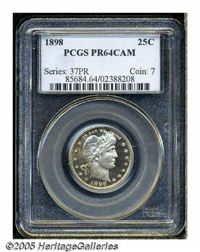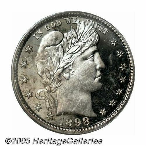 <B>1898<25C> PR64 Cameo PCGS.</B></I> Intricately detailed with a blush of milky golden patina on the left side of the obverse. Contrast on these late 1890's issues is often impressive and this coin is no exception. Just a few nearly undetectable slidemarks from Gem status.<BR><I>From the Dr. Kurt Peters Collection.</B></I> From the Dr. Kurt Peters Collection.