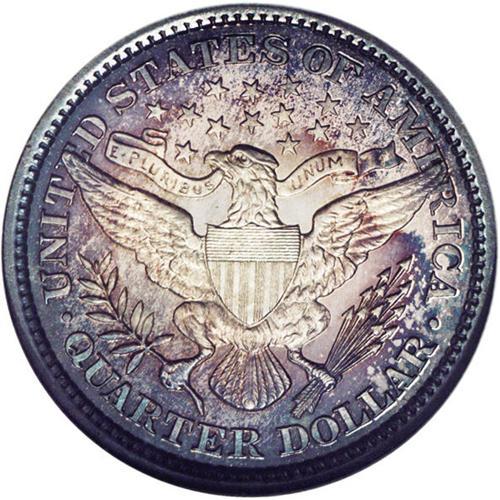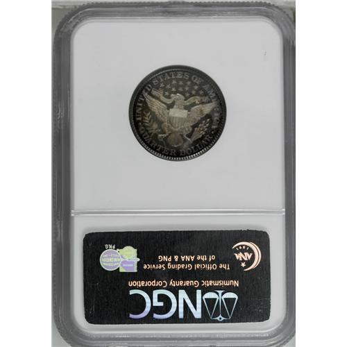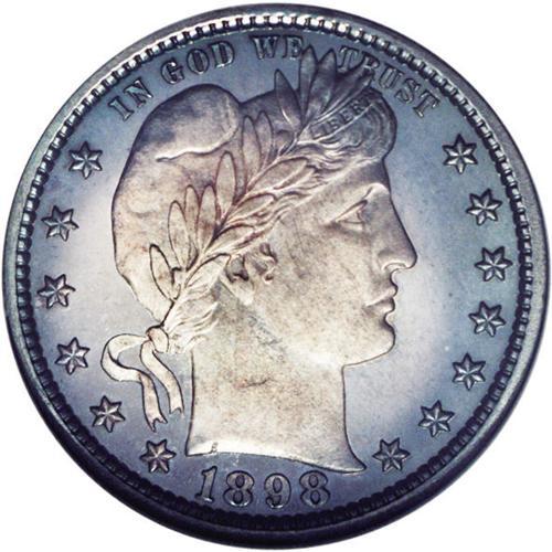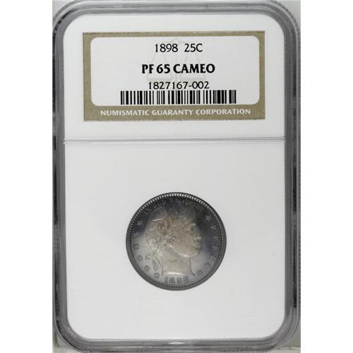 <B>1898<25C> PR65 Cameo NGC.</B></I> The light centers are coated with soft, lilac-gray patina that deepens to gunmetal-blue shades at the outer regions. Only 735 proof pieces were struck.