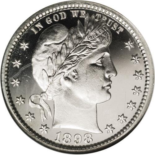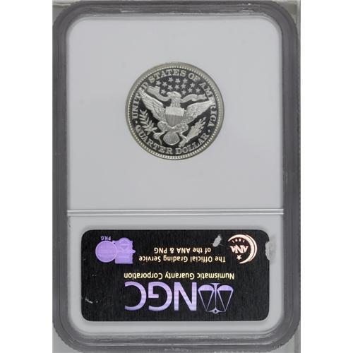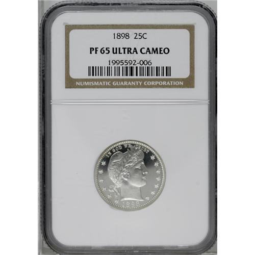 <B>1898<25C> PR65 Deep Cameo NGC.</B></I> When it comes to contrast, perhaps no other late 19th century silver proof issues have greater consistency in this regard than those struck in 1898. The high grade specimen offered here illustrates this point, being completely brilliant with snow-white surfaces on each side and displaying predictably dramatic contrast. Limited in grade by a few slide marks on Liberty's cheek.