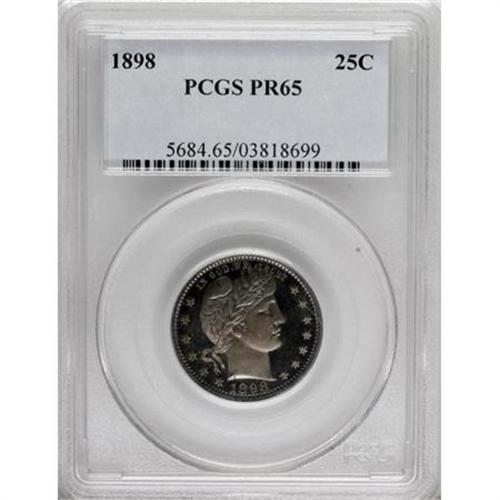 <B>1898 25C PR65 PCGS.</B></I> Apple-green, rose-red, and gold endow this needle-sharp Gem. Even prolonged inspection fails to find any hairlines or planchet imperfections. A stingy 735 proofs were produced.<BR><BR><b>Shipping:</b> Coins & Currency (<a target="_blank" href="http://www.heritageauctions.com/common/shipping.php">view shipping information</a>)