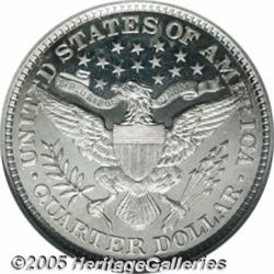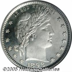 <B>1898 25C PR66 Cameo NGC.</B></I> The devices are consistently frosty and demonstrate pleasing contrast, despite a light blanket of lime-green patina. Thorough inspection of the fields does not reveal any noticeable hairlines. A stingy 735 pieces were struck. Population: 11 in 66 Cameo, 23 finer (2/05).