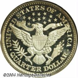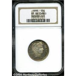 <B>1898<25C> PR66 Cameo NGC.</B></I> The 1898 is one of the best produced dates in the entire Barber series, and is often the date of choice for type collectors. This is a lovely, deeply mirrored proof striking that has noticeable mint frost over the devices. The obverse displays scattered golden toning while the reverse is brilliant. <BR><BR><B>Important notice:</B> Heritage usually auctions material at the rate of 200-250 lots per hour. On some occasions eBay Live bid software or the Internet may not be able to keep up with the pace of the auction. We recommend placing a realistic absentee bid now as insurance to avoid disappointment. Occasionally the auctioneer may eliminate or reject an eBay Live bid, and the auctioneer may also reopen a lot after the close of the eBay live bidding (usually because we missed an audience bid), and may reject your bid even if it shows you as the winning bidder. By bidding via eBay Live, you agree that Heritage may award the lot to another bidder at its sole discretion under the circumstances described above or any other reasonable circumstances. Since eBay bids are not shown to us until we open the lot on the floor, we treat those bids just like floor bids. In most cases the floor responds before the eBay bid is presented to us, due to Internet lag time, so for consistency we have made it a policy that floor bids are always considered first over tie eBay live bids. Also please note that all Heritage lots purchased through eBay Live carry a 20% Buyer's Premium. Please make sure you read the Terms and Conditions before you bid. </span></font></tr></table></td></tr></table>