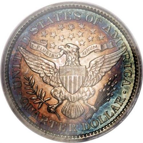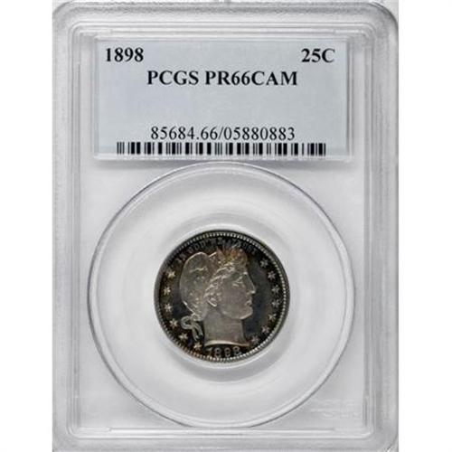 <B>1898 25C PR66 Cameo PCGS.</B></I> The technical quality and visual appeal of this Premium Gem Barber quarter are simply outstanding. The stark cameo contrast on both sides is made even more dramatic by the richness of the variegated shades of dark toning in the fields and near the peripheries. The 1898 is one of the best produced dates in the entire Barber series, and is often the date of choice for type collectors. Population: 8 in 66 Cameo, 11 finer (12/07). <BR><BR><b>Shipping:</b> Coins & Currency (<a target="_blank" href="http://www.heritageauctions.com/common/shipping.php">view shipping information</a>)