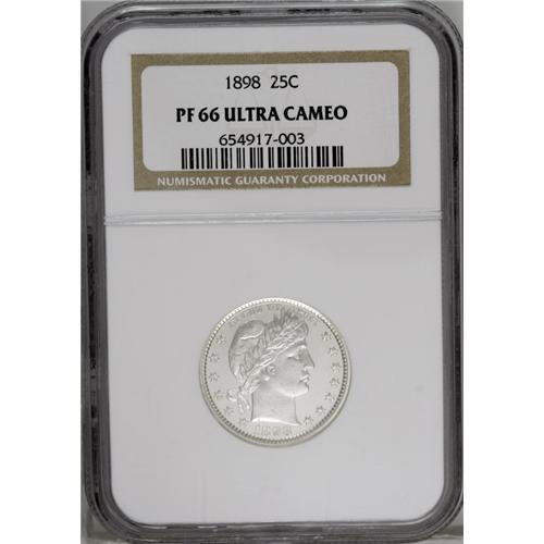 <B>1898<25C> PR66 Deep Cameo NGC.</B></I> Untoned with the most profound field-to-device contrast imaginable. Only a few trivial disturbances to the heavy mint frost on the portrait, visible only under magnification, keep this dazzling specimen from Superb status. Census: 4 in 66 Deep Cameo, 31 finer (3/06).