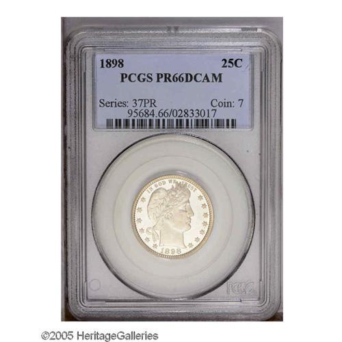 <B>1898<25C> PR66 Deep Cameo PCGS.</B></I> When it comes to contrast, perhaps no other late 19th century silver proof issues have greater consistency in this regard than those struck in 1898. The high grade specimen offered here illustrates this point, being fully brilliant on each side and displaying predictably dramatic contrast. Population: 6 in 66, 15 finer (11/05).