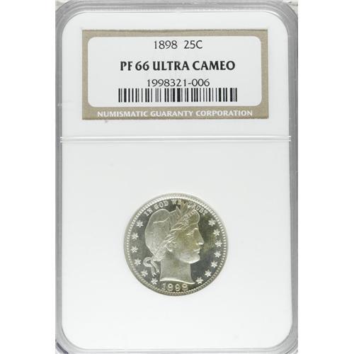<B>1898 25C PR66 Ultra Cameo NGC.</B></I> Outstanding field-motif contrast shows over each side. Nearly untoned, except for a light blush of gold color on the obverse. A powerful strike emboldens the design elements, and virtually pristine surfaces are evident throughout. Census: 5 in 66, 37 finer (4/07).<BR><BR><b>Shipping:</b> Coins & Currency (<a target="_blank" href="http://www.heritageauctions.com/common/shipping.php">view shipping information</a>)