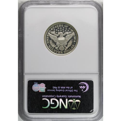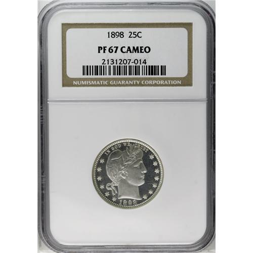 <B>1898<25C> PR67 Cameo NGC.</B></I> Subtle gold toning graces the reverse, although the obverse is virtually stone-white. This exactingly struck Superb Gem has nicely frosted devices and refreshingly smooth mirrored fields. Outstanding quality for the proof issue, which is limited to 735 pieces. Census: 21 in 67 Cameo, 9 finer (6/06).<BR><I>From The Mulholland Collection.</B></I>