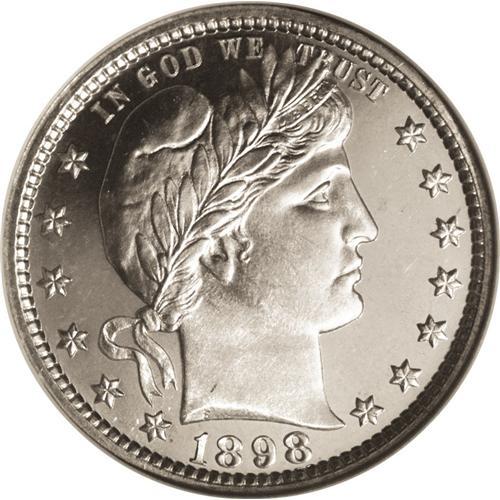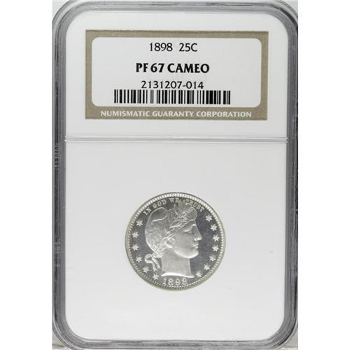 <B>1898 25C PR67 Cameo NGC.</B></I> Subtle gold toning graces the reverse, although the obverse is essentially silver-white. This exactingly struck Superb Gem has nicely frosted devices and smooth, mirrored fields. Outstanding quality for this proof issue of 735 pieces. Census: 20 in 67 Cameo, 9 finer (12/06).<BR><BR><b>Shipping:</b> Coin/Currency (<a target="_blank" href="http://www.heritageauctions.com/common/shipping.php">view shipping information</a>)