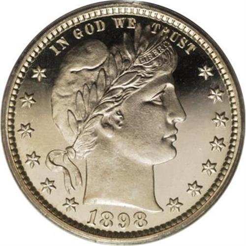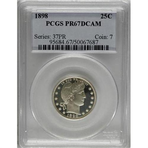 <B>1898 25C PR67 Deep Cameo PCGS.</B></I> The exceptional contrast between the snow-white devices and the decisively mirrored fields provides outstanding eye appeal. This razor-sharp and brilliant Superb Gem is one of 735 pieces struck, and few among them can match the technical quality and white-on-black contrast of the present specimen. This PR67 Deep Cameo is one of 41 coins so graded for the entire type, with 13 Deep Cameos finer. Population: 13 in 67 Deep Cameo, 4 finer (7/07).<BR><BR><b>Shipping:</b> Coins & Currency (<a target="_blank" href="http://www.heritageauctions.com/common/shipping.php">view shipping information</a>\)