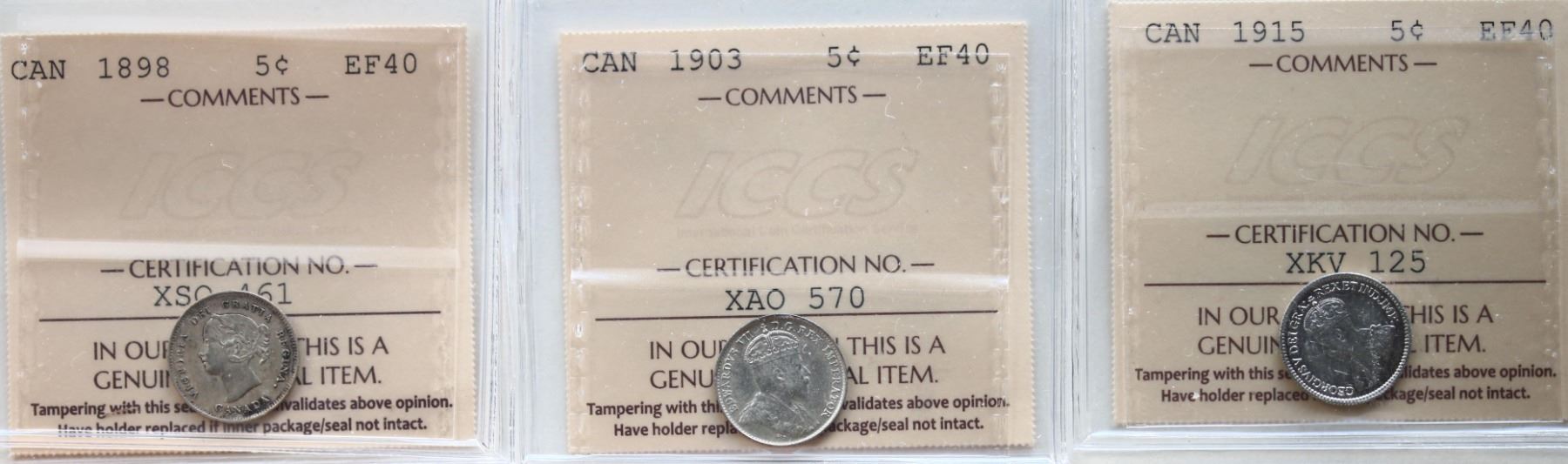 1898 5¢,1903, 1915. Lots of 3 coins ICCS Extra Fine-40