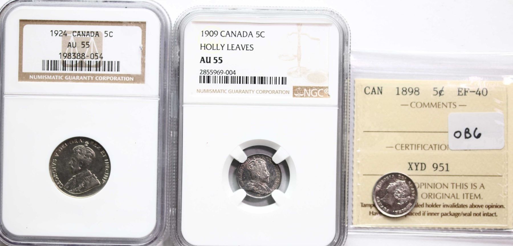 1898 5¢ ICCS Extra Fine-40, 1909 "RL" NGC Choice About Uncirculated-55, 1924 NGC Choice About Uncirc