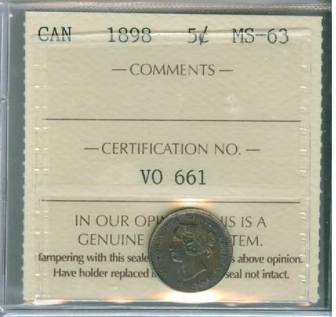 1898 5¢ ICCS MS63. Darkish bluish brown tint.