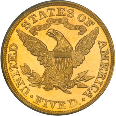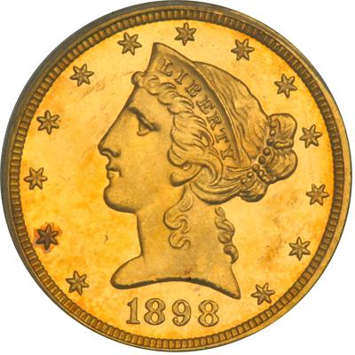 1898 $5 Liberty. PCGS graded Proof 62 Deep Cameo. Only 75 proofs struck. A theme that runs through all the Liberty Proof half eagles is rarity. The 1898 is typical with its low mintage, low survival, a rare appearance in auctions. This coin has some obvious hairlines, which of course, account for the grade. Several contact marks are also scattered over each side. The devices are well frosted with deeply reflective mirrors in the fields. A rare opportunity for the specialist. Pop 1; 9 finer in DCAM. (PCGS # 98493).