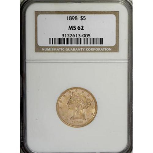<B>1898 $5 MS62 NGC.</B></I> . NGC Census: (607/385). PCGS Population (209/136). Mintage: 633,495. Numismedia Wsl. Price for NGC/PCGS coin in MS62: $325. (#8396)<BR><BR><B>Coin Engraver:</B> Christian Gobrecht<BR><BR><b>Shipping:</b> Coins & Currency (<a target="_blank" href="http://www.heritageauctions.com/common/shipping.php">view shipping information</a>)
