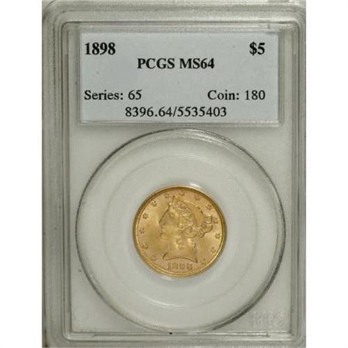 <B>1898 $5 MS64 PCGS.</B></I> PCGS Population (39/4). NGC Census: (104/30). Mintage: 633,495. Numismedia Wsl. Price for NGC/PCGS coin in MS64: $1,330. (#8396)<BR><BR><B>Coin Engraver:</B> Christian Gobrecht<BR><BR><b>Shipping:</b> Coins & Currency (<a target="_blank" href="http://www.heritageauctions.com/common/shipping.php">view shipping information</a>)