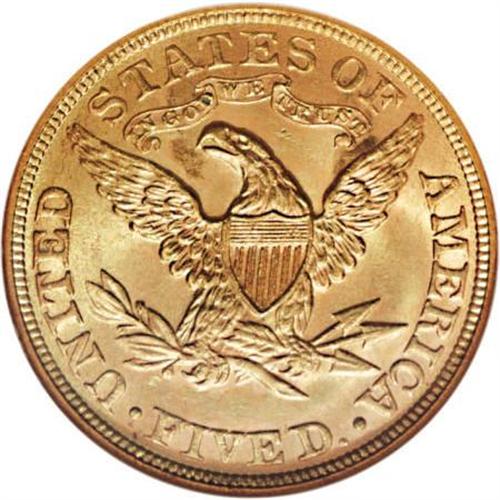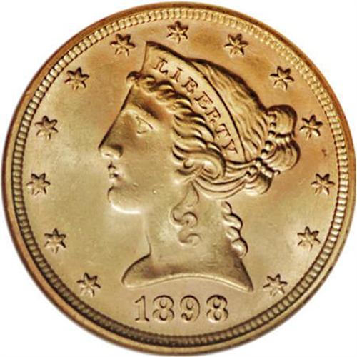 <B>1898 $5 MS65 NGC.</B></I> This meticulously struck Gem has lovely apricot and green-gold toning. Careful rotation reveals a few wispy field grazes, but the quality is vastly superior to the typically abraded Mint State examples usually encountered. Very scarce as a Gem relative to common dates such as the 1901-S. Census: 22 in 65, 8 finer (8/07).<BR><BR><B>Coin Engraver:</B> Christian Gobrecht<BR><BR><b>Shipping:</b> Coins & Currency (<a target="_blank" href="http://www.heritageauctions.com/common/shipping.php">view shipping information</a>)