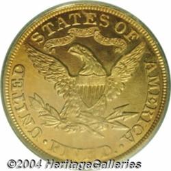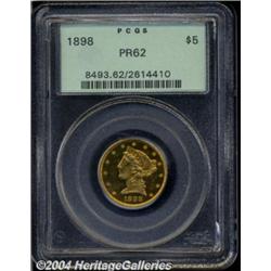 <B>1898<$5> PR62 PCGS.</B></I> Despite the relative availability of business strikes, proofs of this date are quite rare. Only 75 were originally produced, and of that number Breen estimates that today perhaps as few as 25 may still exist in all grades. This is a stunning, two-toned cameo. The fields go "black" and contrast heavily against the thick mint frost on the devices. Exceptional eye appeal, but unfortunately, the obverse fields show two severe abrasions at the forehead and behind the neck. Still, a stunning and rare coin that, despite its problems, is clearly superior for the grade. <BR><BR><B>Important notice:</B> Heritage usually auctions material at the rate of 200-250 lots per hour. On some occasions eBay Live bid software or the Internet may not be able to keep up with the pace of the auction. We recommend placing a realistic absentee bid now as insurance to avoid disappointment. Occasionally the auctioneer may eliminate or reject an eBay Live bid, and the auctioneer may also reopen a lot after the close of the eBay live bidding (usually because we missed an audience bid), and may reject your bid even if it shows you as the winning bidder. By bidding via eBay Live, you agree that Heritage may award the lot to another bidder at its sole discretion under the circumstances described above or any other reasonable circumstances. Since eBay bids are not shown to us until we open the lot on the floor, we treat those bids just like floor bids. In most cases the floor responds before the eBay bid is presented to us, due to Internet lag time, so for consistency we have made it a policy that floor bids are always considered first over tie eBay live bids. Also please note that all Heritage lots purchased through eBay Live carry a 20% Buyer's Premium. Please make sure you read the Terms and Conditions before you bid. </span></font></tr></table></td></tr></table>