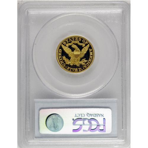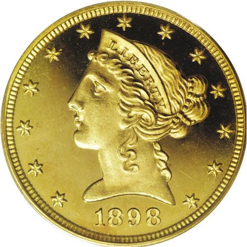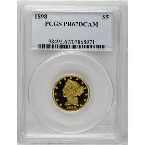 <B>1898 $5 PR67 Deep Cameo PCGS.</B></I> Both sides of this amazing piece have rich orange-gold color. This piece is fully struck with every individual design detail boldly rendered. The deeply mirrored fields and highly lustrous devices combine to present incredible "black and gold" contrast. A tiny break in the frost is evident on Liberty's chin, and a miniscule v-shaped lint mark just inside star 3 are the only readily apparent pedigree markers on the obverse of this piece. The reverse has an extremely small black dot on the upper edge of the left facing wing, vertically below the G in GOD. This will also serve the pedigree researcher.<BR> Unlike other denominations, the proof half eagles are generally found in lower grades. This piece is the finest 1898 proof half eagle certified by PCGS, and the only example to receive this grade (11/06). NGC claims a PR67 <img border='0' src='http://www.heritagecoins.com/images/star.gif' width=10 height=10> Ultra Cameo and a single PR68 Ultra Cameo example, the only two coins to be given a better grade assessment.<BR> The half eagles boasted a much smaller mintage than the similarly dated proof quarter eagle. Just 75 of these pieces were coined as proofs, and about 25 or 30 still exist today. The mintage difference obviously represents an increased demand for quarter eagles with their smaller face value. In his <I>Proof Encyclopedia,</B></I> Walter Breen pointed to the lower mintage and the small number of auction appearances, and called this date "a sleeping golden elephant."<BR><BR><b>Shipping:</b> Coin/Currency (<a target="_blank" href="http://www.heritageauctions.com/common/shipping.php">view shipping information</a>)