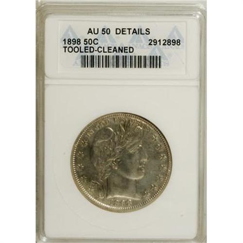 <B>1898 50C --Cleaned, Tooled--ANACS. AU50 Details.</B></I> NGC Census: (1/125). PCGS Population (5/172). Mintage: 2,956,735. Numismedia Wsl. Price for NGC/PCGS coin in AU50: $267. (#6480)<BR><BR><B>Coin Engraver:</B> Charles E. Barber<BR><BR><b>Shipping:</b> Coins & Currency (<a target="_blank" href="http://www.heritageauctions.com/common/shipping.php">view shipping information</a>\)