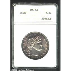 1898 50C MS61 ANACS. Attractive mauve-purple patina. A lustrous Barber Half that has only the faintest slide marks on the portrait, while the reverse is extremely clean.From the Ohio Collection. Important notice: We expect to be auctioning lots at the rate of 200-250 per hour. Sometimes eBay Premier live bid software cannot keep up with that pace, so we strongly recommend that you place a realistic proxy bid now as insurance to avoid disappointment. Also please note that all Heritage/CAA lots purchased through eBay Premier carry a 20% Buyer's Premium. Please make sure you read the Terms and Conditions.