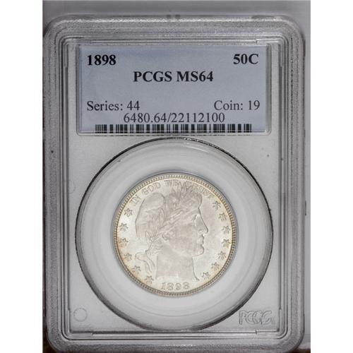 <B>1898 50C MS64 PCGS.</B></I> Light peripheral obverse toning gives way to somewhat deeper golden-red and sky-blue patina around portions of the reverse borders. All of the design elements are well impressed. A few minor luster grazes on Liberty's cheek and neck limit the grade. Population: 37 in 64, 15 finer (12/05).