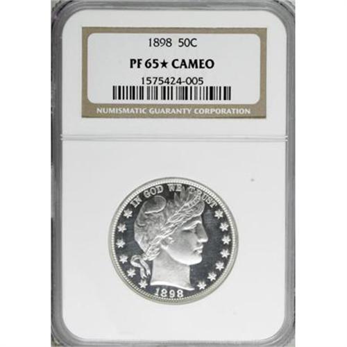 <B>1898 50C PR65 </B></I> S<B> Cameo NGC.</B></I> An outstanding Barber half of any date. This exceptional proof does indeed have extra eye appeal for the grade, as indicated by the star designation. The fields show unfathomable depth of reflectivity, and the devices have considerable mint frost that, when combined with the mirrored surfaces, produce a strong cameo effect. Brilliant on both obverse and reverse.<BR><BR><b>Shipping:</b> Coins & Currency (<a target="_blank" href="http://www.heritageauctions.com/common/shipping.php">view shipping information</a>)
