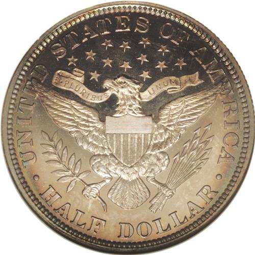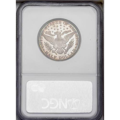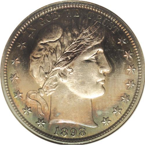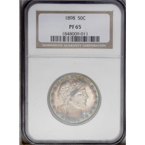 <B>1898<50C> PR65 NGC.</B></I> Colorful burnt-orange and cobalt-blue obverse toning lightens several shades across the interior, while similar colorations are less dramatically, but more evenly dispersed on the reverse. An eye-catching Gem with an intriguing combination of rich color and deep, glassy mirrors.