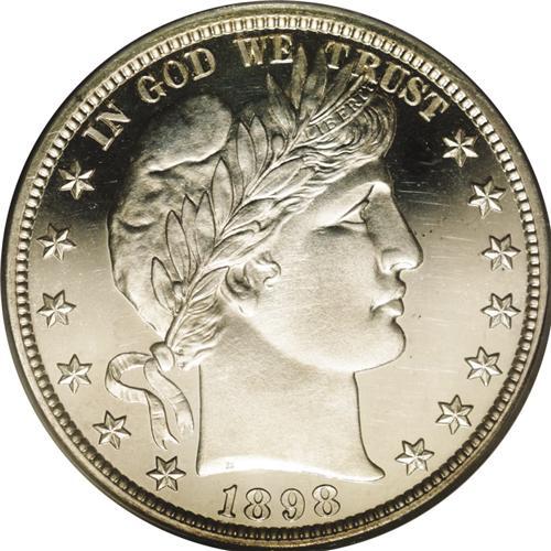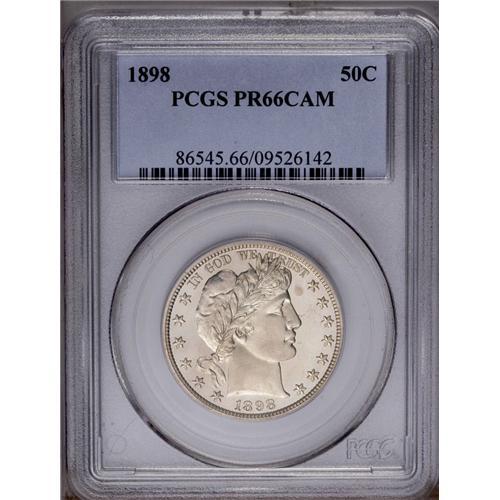 <B>1898<50C> PR66 Cameo PCGS.</B></I> A beautiful cameoed appearance graces both sides of this essentially untoned 1898 Barber half dollar, and the design elements are razor sharp. An almost invisible toning spot is noted between Liberty's forehead and star 7. Population: 4 in 66 Cameo, 2 finer (4/06).