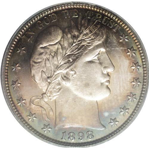 <B>1898 50C PR66 Cameo PCGS.</B></I> The 1898 is generally recognized as one of the best-produced and also best-preserved proof dates from the 1890s. This is an exceptionally attractive example that has the usual deep mirrors in the fields and thick mint frost over the devices, the combination of which produces the desirable cameo effect. Both sides are generally untoned in the centers with rings of russet and deep blue color around the margins. Pinpoint striking details throughout and problem-free. Population: 6 in 66, 3 finer (9/06).<BR><BR><b>Shipping:</b> Coin/Currency (<a target="_blank" href="http://www.heritageauctions.com/common/shipping.php">view shipping information</a>)