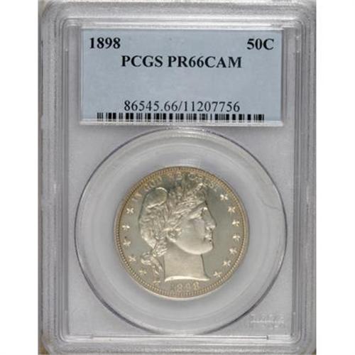 <B>1898 50C PR66 Cameo PCGS.</B></I> Razor-sharp striking details and impeccable surface preservation are among the attributes of this conditionally scarce Premium Gem. Heavily frosted devices and highly reflective fields produce noteworthy cameo contrast on both sides. Light golden toning is seen near the peripheries. A lovely proof coin from a well produced issue in the Barber half dollar series. Population: 7 in 66 Cameo, 3 finer (4/07). <BR><BR><b>Shipping:</b> Coins & Currency (<a target="_blank" href="http://www.heritageauctions.com/common/shipping.php">view shipping information</a>)