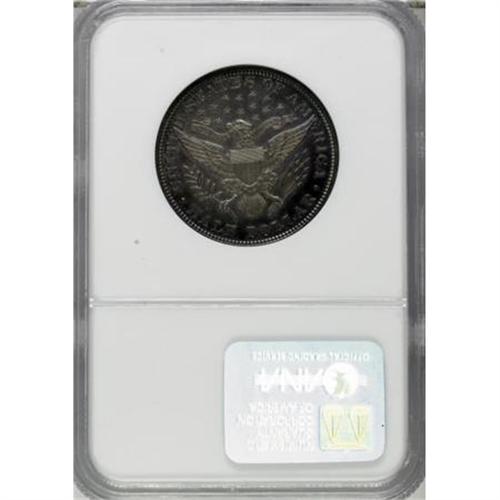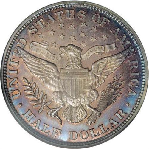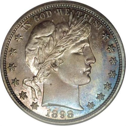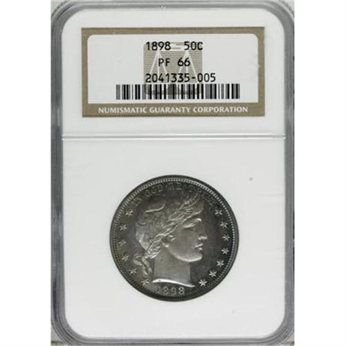 <B>1898 50C PR66 NGC.</B></I> Rotation beneath a light reveals iridescent electric-blue, salmon-pink, and pumpkin-orange patina. The strike is razor-sharp, and the surfaces appear immaculate aside from a trivial gray fleck on Liberty's neck. A stingy 735 proofs were struck. Census: 23 in 66, 32 finer (6/07).<BR><BR><B>Coin Engraver:</B> Charles E. Barber<BR><BR><b>Shipping:</b> Coins & Currency (<a target="_blank" href="http://www.heritageauctions.com/common/shipping.php">view shipping information</a>\)