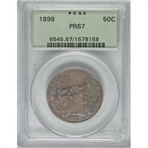 <B>1898 50C PR67 PCGS.</B></I> Mottled lavender-gray patina dominates this coin's outward appearance, but there are splashes of olive-gold patina on the obverse over the top of Liberty's face and in the upper right field. Fully struck with no noticeable blemishes. While the toning scheme may not be for everyone, the originality and nearly perfect technical quality are undeniable. Population: 14 in 67, 0 finer (11/07).<BR><I>Ex: Franklin Sale (Kingswood, 10/2001), lot 310, where it realized $7,590, May 2003 Long Beach Auction (Heritage, 5/2003), lot 6272.</B></I><BR><BR><B>Coin Engraver:</B> Charles E. Barber<BR><BR><b>Shipping:</b> Coins & Currency (<a target="_blank" href="http://www.heritageauctions.com/common/shipping.php">view shipping information</a>)