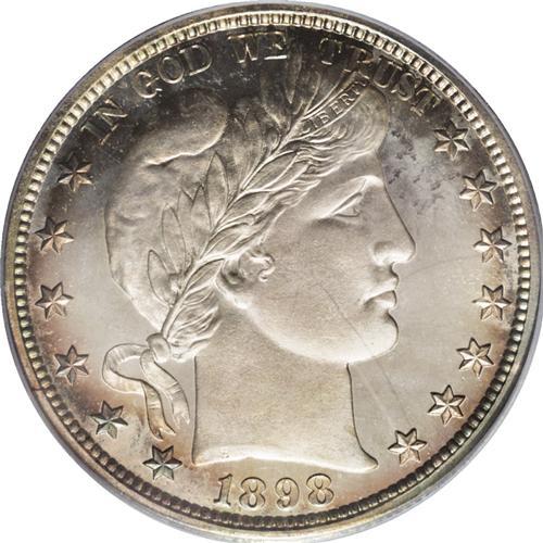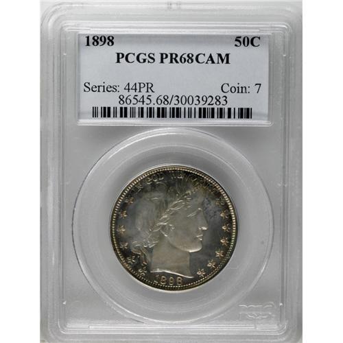 <B>1898 50C PR68 Cameo PCGS.</B></I> This year saw 735 proofs produced. A high percentage of those coins have apparently survived, as around 500 have been graded by NGC and PCGS. Only about twenty-five percent of that number have received either the Cameo or Deep Cameo designation, however; and the currently offered specimen is the single highest-graded coin at PCGS, among those in the Cameo category.<BR> This piece shows frosty devices, strongly contrasted against the highly reflective fields. Low-intensity, variegated gold, violet, and pale blue toning presents a thin film over each side, in no way impeding the coin's reflectivity. The design elements exhibit razor-sharp definition, and no marks of any consequence are apparent over the amazingly well preserved surfaces. This piece will be a striking addition to any advanced Barber half dollar collection. Population: 1 in 68 Cameo, 0 finer (10/06).<BR><BR><b>Shipping:</b> Coin/Currency (<a target="_blank" href="http://www.heritageauctions.com/common/shipping.php">view shipping information</a>)