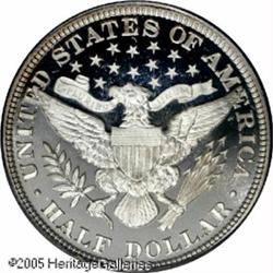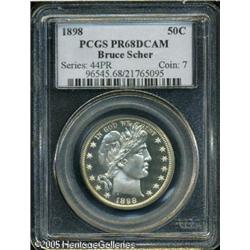 <B>1898 50C PR68 Deep Cameo PCGS.</B></I> This year saw only 735 proofs produced. The present, wonderfully preserved example shows the frosty devices strongly contrasted against the highly reflective fields. Just the slightest hint of pastel-champagne patina accents each side of this otherwise brilliant piece. The design elements exhibit razor sharp definition, and no marks of any consequence are apparent over the loving preserved surfaces. This specimen will be a striking addition to an advanced Barber Half Dollar collection. Presently, (1/05), this is the single finest Deep Cameo example certified by PCGS.<BR><I>From the Bruce Scher #1 All-Time PCGS Registry Set.</B></I> Lot:4114
