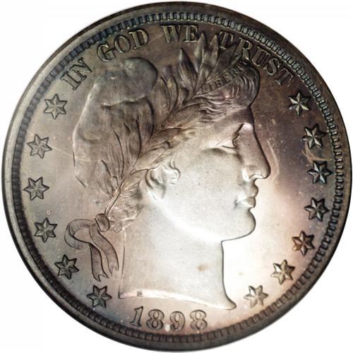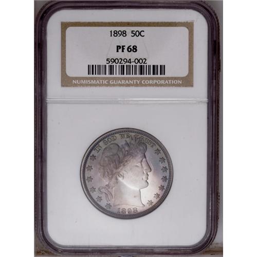 <B>1898<50C> PR68 NGC.</B></I> The mintage of the 1898 half dollar in proof format was just 735 pieces, and it is highly unlikely that any of the other high grade survivors of this popular date could equal the interesting eye appeal of this coin. An off center, parabola-shaped area of brilliance is seen in the center of the obverse and also on the reverse. Elsewhere, the surfaces are a blend of deep gray-tan and blue. Amazing quality and virtually perfect. Census: 10 in 68, 0 finer (3/06). <BR><BR><B>Important notice:</B> Heritage usually auctions material at the rate of 200-250 lots per hour. On some occasions eBay Live bid software or the Internet may not be able to keep up with the pace of the auction. We recommend placing a realistic absentee bid now as insurance to avoid disappointment. Occasionally the auctioneer may eliminate or reject an eBay Live bid, and the auctioneer may also reopen a lot after the close of the eBay live bidding (usually because we missed an audience bid), and may reject your bid even if it shows you as the winning bidder. By bidding via eBay Live, you agree that Heritage may award the lot to another bidder at its sole discretion under the circumstances described above or any other reasonable circumstances. Since eBay bids are not shown to us until we open the lot on the floor, we treat those bids just like floor bids. In most cases the floor responds before the eBay bid is presented to us, due to Internet lag time, so for consistency we have made it a policy that floor bids are always considered first over tie eBay live bids. Also please note that all Heritage lots purchased through eBay Live carry a 20% Buyer's Premium. Please make sure you read the Terms and Conditions before you bid. This lot is being auctioned in conjunction with a live floor auction by Heritage Galleries & Auctioneers. All final auction and invoice information will be supplied by Heritage Galleries & Auctioneers, and all other information should be considered preliminary. Lot:2087 <BR><BR><B>Winning Notification and Billing:</B> After the FINAL session in this auction is complete, Heritage will send e-mail and snail mail invoices. This process normally takes several days. All final auction and invoice information will be supplied by Heritage Galleries & Auctioneers, and all other information should be considered preliminary. <BR><BR>This auction will be conducted on a live auction floor and over the Internet through eBay Live. If you choose to place an absentee bid, please take a moment to <font color='#0000ff'><u><a href='http://pages.ebay.com/liveauctions/help/before/laabsentee.html'>learn how eBay Live absentee bidding works</a></u></font><font color='#000000'>