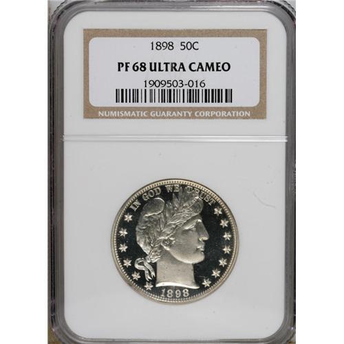 <B>1898 50C PR68 Ultra Cameo NGC.</B></I> This is a pristine, virtually black-and-white beauty with the barest hint of gold color near the peripheries. The pronounced contrast and liquid mirrors in the fields clearly merit the Ultra Cameo designation assigned by NGC. A couple of minuscule nicks on Liberty's neck appear to be the only grade-limiting factor, and might serve together in the future as a pedigree marker. Neither of the major grading services has assigned a PR69 grade to any 1898 half dollar to date, and only five such coins have received a grade of PR68 with the Ultra/Deep Cameo designation (4/07). This beauty is undoubtedly destined for a top-of-the-line set of proof Barber halves.<BR><BR><b>Shipping:</b> Coins & Currency (<a target="_blank" href="http://www.heritageauctions.com/common/shipping.php">view shipping information</a>)