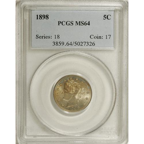 <B>1898 5C MS64 PCGS.</B></I> PCGS Population (151/77). NGC Census: (116/75). Mintage: 12,532,087. Numismedia Wsl. Price: $224. (#3859)<BR><BR><b>Shipping:</b> Coins & Currency (<a target="_blank" href="http://www.heritageauctions.com/common/shipping.php">view shipping information</a>)