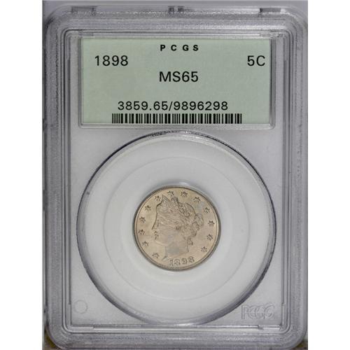 <B>1898<5C> MS65 PCGS.</B></I> Light dove-gray and rose-lilac patina covers both sides of this well struck Gem. The strike is better than usual on this slightly better date, with nearly full details on the highpoint hair and on the lower left ear of corn in the reverse wreath. PCGS has graded 15 finer (3/06). <BR><BR><B>Important notice:</B> Heritage usually auctions material at the rate of 200-250 lots per hour. On some occasions eBay Live bid software or the Internet may not be able to keep up with the pace of the auction. We recommend placing a realistic absentee bid now as insurance to avoid disappointment. Occasionally the auctioneer may eliminate or reject an eBay Live bid, and the auctioneer may also reopen a lot after the close of the eBay live bidding (usually because we missed an audience bid), and may reject your bid even if it shows you as the winning bidder. By bidding via eBay Live, you agree that Heritage may award the lot to another bidder at its sole discretion under the circumstances described above or any other reasonable circumstances. Since eBay bids are not shown to us until we open the lot on the floor, we treat those bids just like floor bids. In most cases the floor responds before the eBay bid is presented to us, due to Internet lag time, so for consistency we have made it a policy that floor bids are always considered first over tie eBay live bids. Also please note that all Heritage lots purchased through eBay Live carry a 20% Buyer's Premium. Please make sure you read the Terms and Conditions before you bid. This lot is being auctioned in conjunction with a live floor auction by Heritage Galleries & Auctioneers. All final auction and invoice information will be supplied by Heritage Galleries & Auctioneers, and all other information should be considered preliminary. Lot:937 <BR><BR><B>Winning Notification and Billing:</B> After the FINAL session in this auction is complete, Heritage will send e-mail and snail mail invoices. This process normally takes several days. All final auction and invoice information will be supplied by Heritage Galleries & Auctioneers, and all other information should be considered preliminary. <BR><BR>This auction will be conducted on a live auction floor and over the Internet through eBay Live. If you choose to place an absentee bid, please take a moment to <font color='#0000ff'><u><a href='http://pages.ebay.com/liveauctions/help/before/laabsentee.html'>learn how eBay Live absentee bidding works</a></u></font><font color='#000000'>