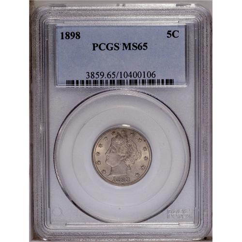 <B>1898<5C> MS65 PCGS.</B></I> The softly frosted surfaces are overlain with interesting golden-brown and gray toning. A problem-free type coin. Population: 58 in 65, 15 finer (3/06). <BR><BR><B>Important notice:</B> Heritage usually auctions material at the rate of 200-250 lots per hour. On some occasions eBay Live bid software or the Internet may not be able to keep up with the pace of the auction. We recommend placing a realistic absentee bid now as insurance to avoid disappointment. Occasionally the auctioneer may eliminate or reject an eBay Live bid, and the auctioneer may also reopen a lot after the close of the eBay live bidding (usually because we missed an audience bid), and may reject your bid even if it shows you as the winning bidder. By bidding via eBay Live, you agree that Heritage may award the lot to another bidder at its sole discretion under the circumstances described above or any other reasonable circumstances. Since eBay bids are not shown to us until we open the lot on the floor, we treat those bids just like floor bids. In most cases the floor responds before the eBay bid is presented to us, due to Internet lag time, so for consistency we have made it a policy that floor bids are always considered first over tie eBay live bids. Also please note that all Heritage lots purchased through eBay Live carry a 20% Buyer's Premium. Please make sure you read the Terms and Conditions before you bid. This lot is being auctioned in conjunction with a live floor auction by Heritage Galleries & Auctioneers. All final auction and invoice information will be supplied by Heritage Galleries & Auctioneers, and all other information should be considered preliminary. Lot:936 <BR><BR><B>Winning Notification and Billing:</B> After the FINAL session in this auction is complete, Heritage will send e-mail and snail mail invoices. This process normally takes several days. All final auction and invoice information will be supplied by Heritage Galleries & Auctioneers, and all other information should be considered preliminary. <BR><BR>This auction will be conducted on a live auction floor and over the Internet through eBay Live. If you choose to place an absentee bid, please take a moment to <font color='#0000ff'><u><a href='http://pages.ebay.com/liveauctions/help/before/laabsentee.html'>learn how eBay Live absentee bidding works</a></u></font><font color='#000000'>