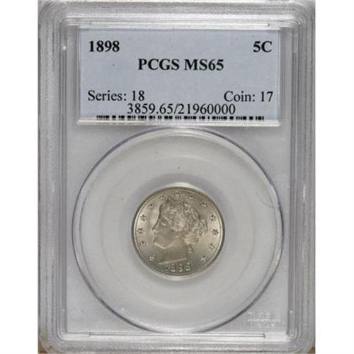 <B>1898 5C MS65 PCGS.</B></I> Delicate golden-gray patina rests on highly lustrous surfaces that exhibit sharply impressed design features. A few minute abrasions are noted over each side. Population: 60 in 65, 17 finer (4/07).<BR><BR><b>Shipping:</b> Coins & Currency (<a target="_blank" href="http://www.heritageauctions.com/common/shipping.php">view shipping information</a>)