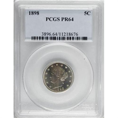 <B>1898 5C PR64 PCGS.</B></I> PCGS Population (171/109). NGC Census: (118/150). Mintage: 1,795. Numismedia Wsl. Price for NGC/PCGS coin in PR64: $220. (#3896)<BR><BR><B>Coin Engraver:</B> Charles E. Barber<BR><BR><b>Shipping:</b> Coins & Currency (<a target="_blank" href="http://www.heritageauctions.com/common/shipping.php">view shipping information</a>\)