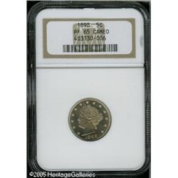 <B>1898 5C PR65 Cameo NGC.</B></I> A light blue and honey haze wafts subtly over the appealing cameoed surfaces. Satisfying mirrors contrast nicely with the moderately mint frosted devices. A couple of small contact marks on the principal obverse device are the only distractions to speak of. Lot:5933
